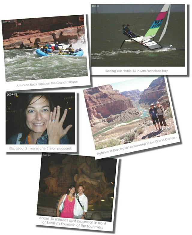 Stefon and Elia first met in youth orchestra about 15 years ago but it took three more years for Elia to realize that Stefon could be more than just a friend and ask him out on a date. Stefon said yes. They dated and fell in love through three years of school at Santa Rosa Junior College and many string quartet and chamber orchestra rehearsals before Elia transferred to UC Berkeley, which is when, out of some silly misguided notion that first love couldn’t possibly last, they broke up. This lasted all of two weeks before they realized they were both miserable, still in love, and that they would be much happier together. Well, nine years, four stints at different schools (Stefon at UC Davis and Elia at Berkeley and Indiana University), four years of living together and many rafting, sailing, and camping trips later they were more in love and still together when, on a trip to Rome, Stefon proposed in the Piazza Navona.